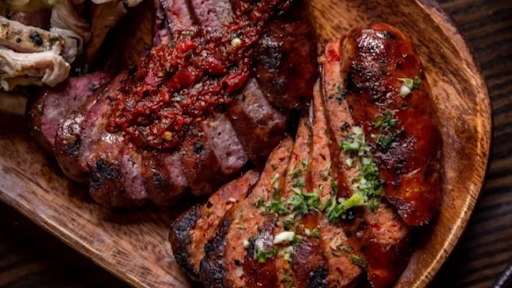 This steakhouse has imported steaks from Pampas, Argentina, served from the grill with fresh chimichurri and salsa criolla, with choices ranging from Pasture-Raised Striploin (14 oz or 16 oz), Filet Mignon (9 oz), Prime Skirt Steak (10 oz), Ribeye (18 oz), or Prime Ribeye (22 oz).